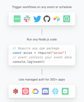 Contrairement à Zapier, Pipedream s'adresse plutôt à la population des développeurs (Node.js) qui aiment voir ce qu'il y a sous le capot et clairement... ils sont comblés ! 🧔🏻